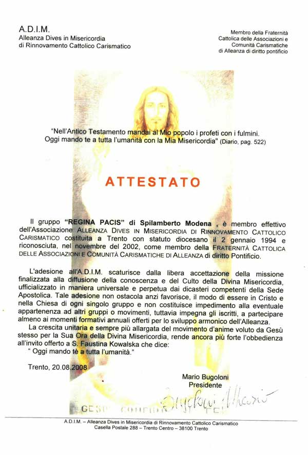 La nostra comunità Regina Pacis aderisce all'Adim, "alleanza Dives in Misericordia", che è un'associazione a carattere nazionale, eretta con decreto canonico e prende il nome dall'omonima enciclica "Dives In Misericordia" di S.Giovanni Paolo II° (del 30 Novembre1980), il cui messaggio è oggi più che mai attuale, tanto da aver ispirato Papa Francesco, a indire un Giubileo straordinario della Misericordia.